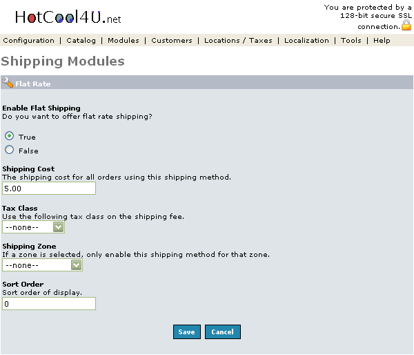 Enable or disable this module with the true/false radio buttons. Note, setting the module to 'False' doesn't uninstall the module -- it only affects whether or not customers will be able to see Flat Rate shipping during checkout.