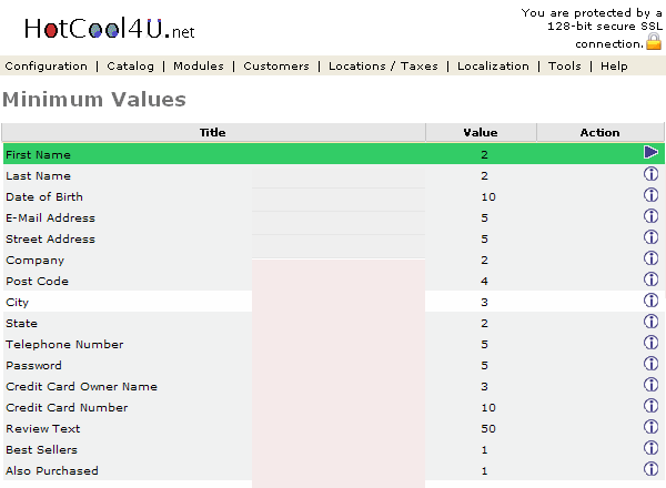 The values set for Minimum values are any fields filled out by the store owner that will affect the minimum amount of text for the credit card owner, credit card number, review text, best sellers, and the minimum number of products a customer has purchased.