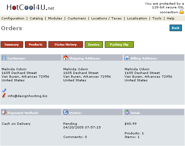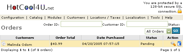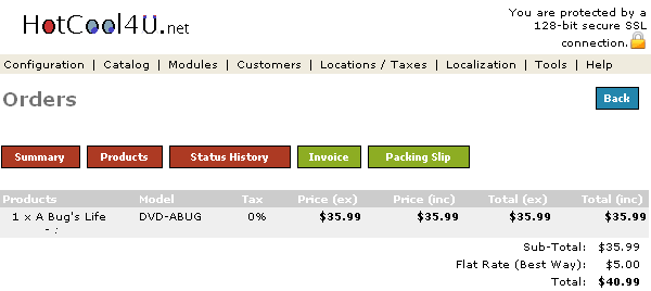 The Invoice graphic link causes a new browser window to open and gives the store owner a printable version of the invoice for the selected order with the purchased products listed and the cost.