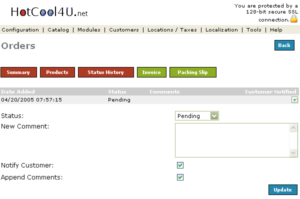 In the Status History area the store owner can change the status of an order, type a new comment to the customer to read when logged into their store account, and by checking the "Notify Customer" and "Append Comments" boxes the customer is notified and a new comment is added for tracking.