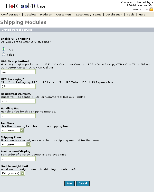 Enable or disable this module with the true/false radio buttons. Note, setting the module to 'False' doesn't uninstall the module -- it only affects whether or not customers will be able to see UPS shipping during checkout
